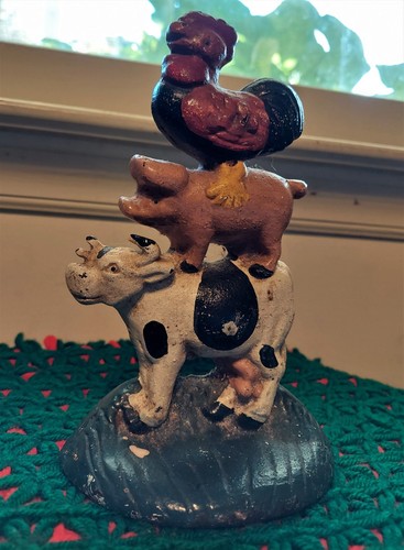 Vintage Cast Iron Doorstop With Cow Pig Rooster Country Farming Door Stop Ebay